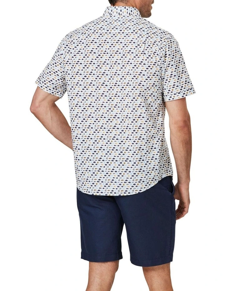 This light weight cotton shirt features a stylish fish pattern that makes for a fun and easy weekend option. This regular fitting shirt is made from a soft cotton that pairs well with denim for a casual off duty style.