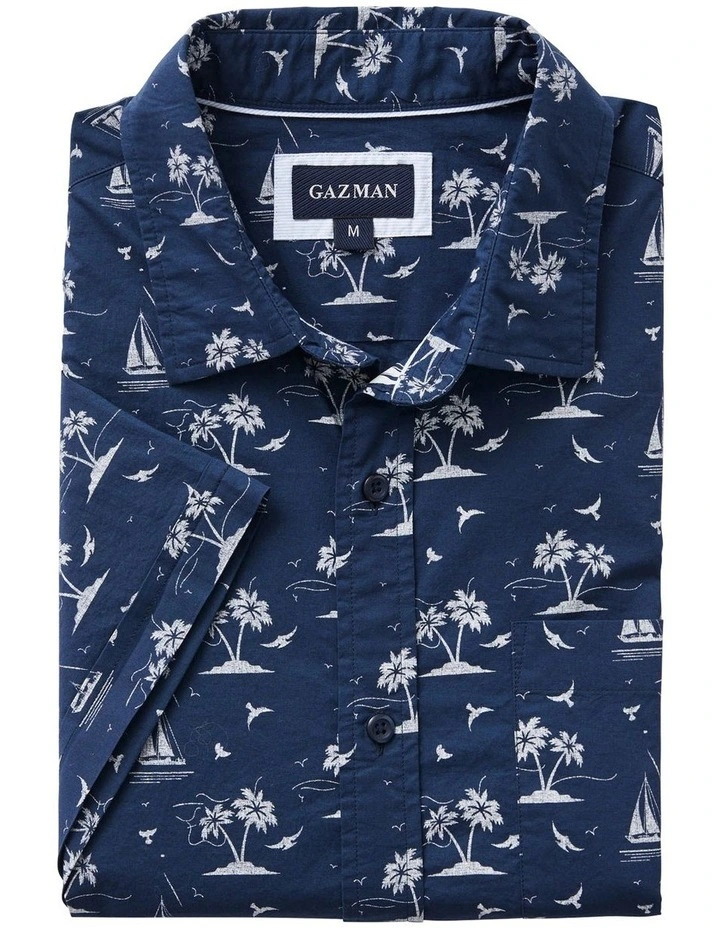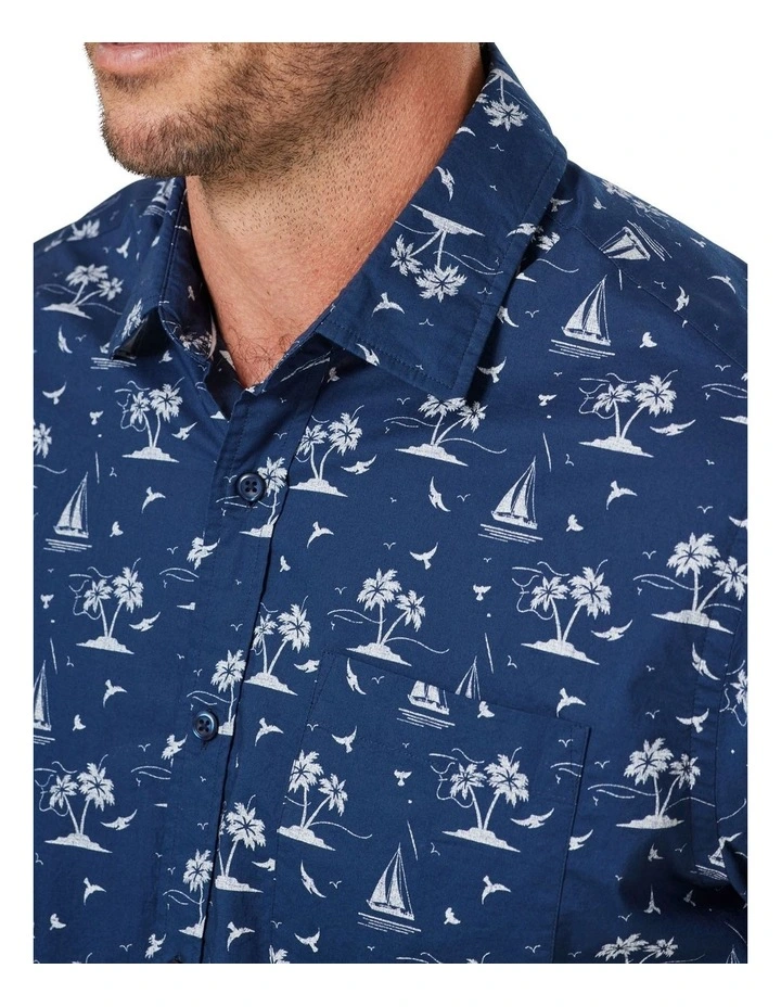 This light weight cotton shirt features a stylish island pattern that makes for a fun and easy weekend option. This regular fitting shirt is made from a soft cotton that pairs well with denim for a casual off duty style.